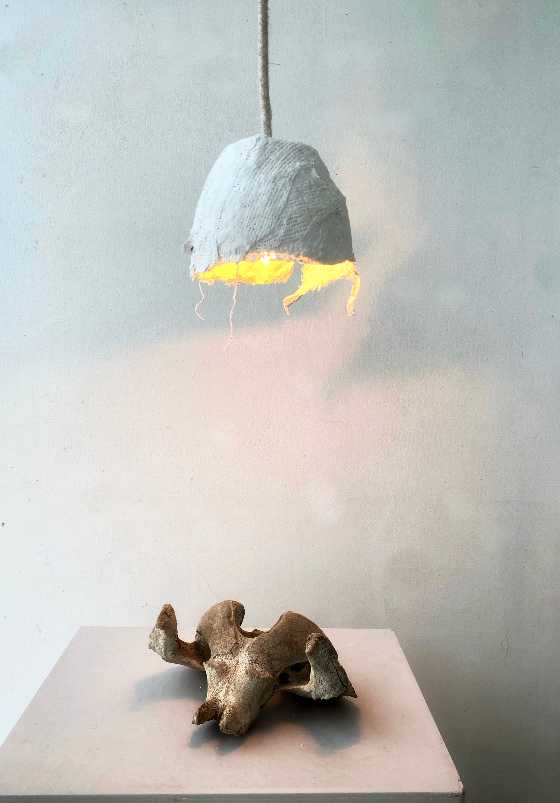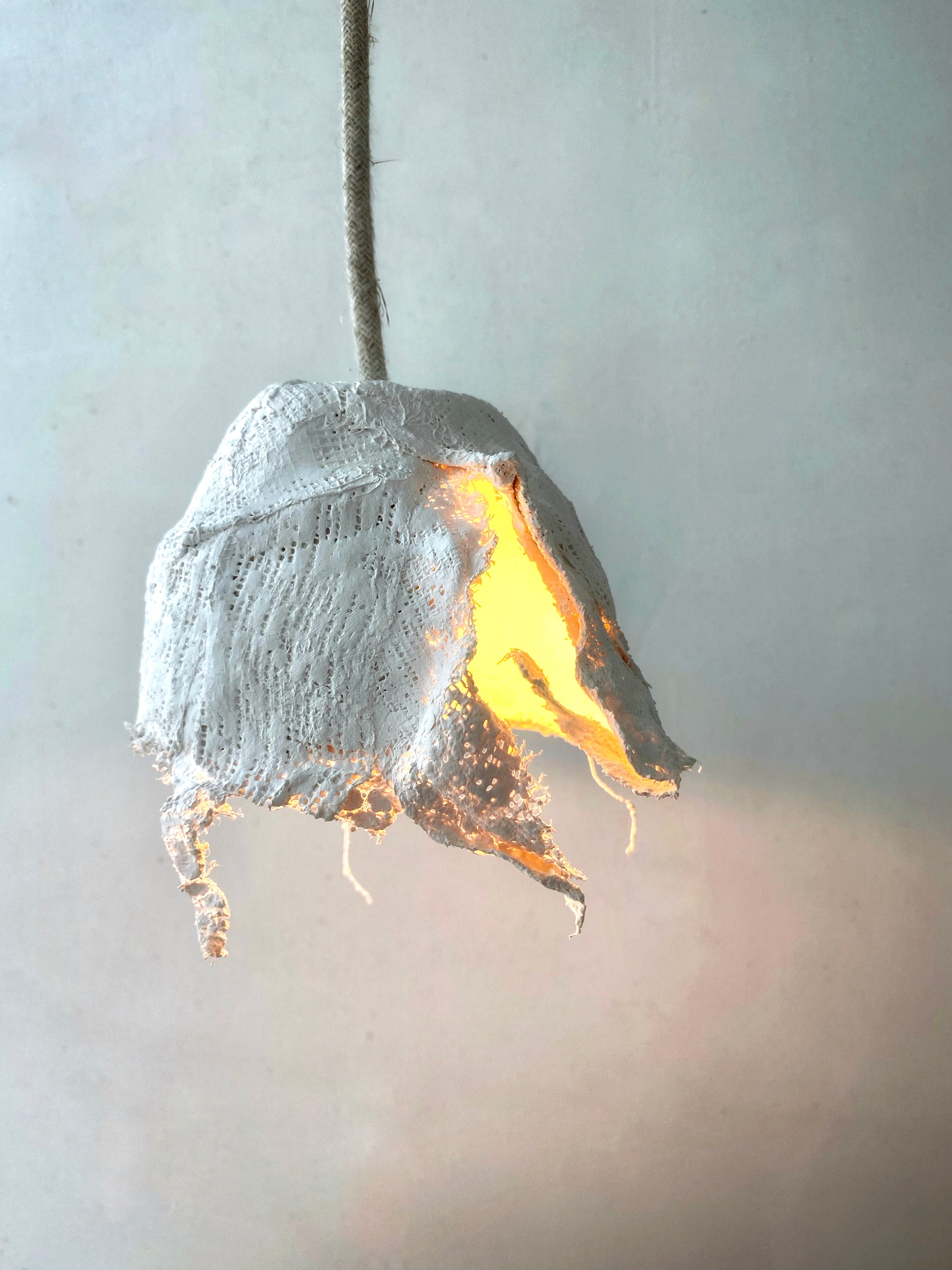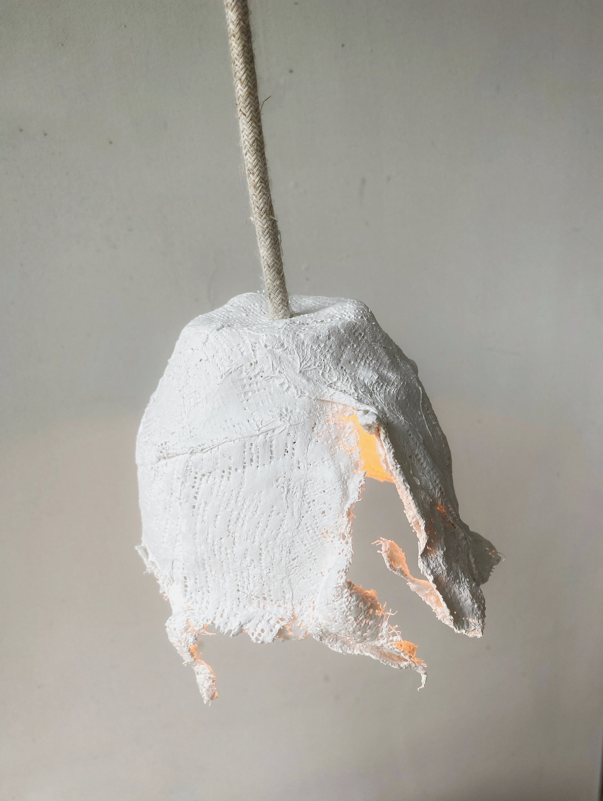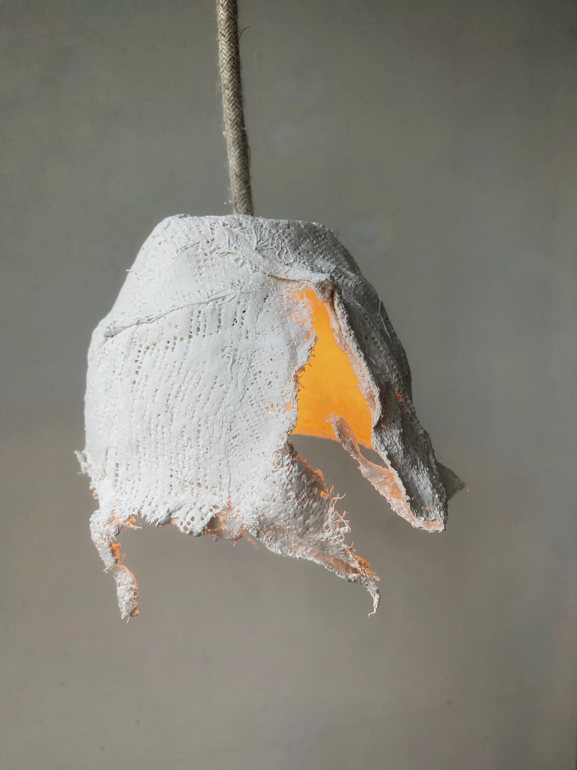 Esta pequeña lámpara está realizada con molde cerámico y vendas de yeso. Su forma única proyecta sombras de una manera única, creando un ambiente muy sugerente.Rematada a mano con cordón textil y rosetón de porcelana. El portalámparas de latón y cerámica le da un aspecto elegante.