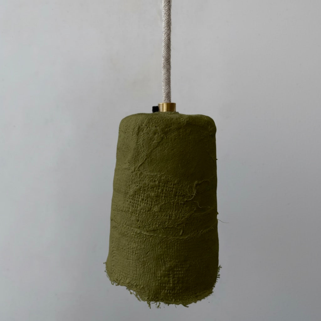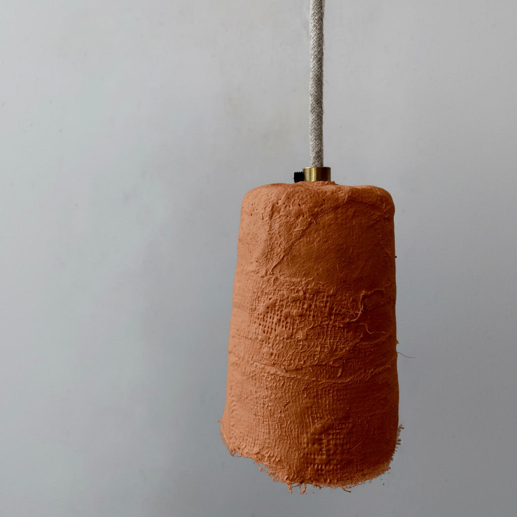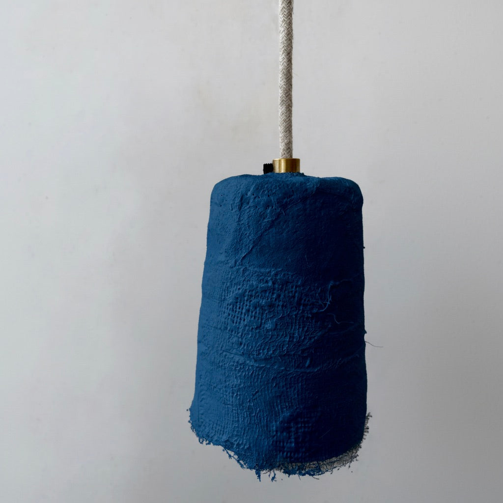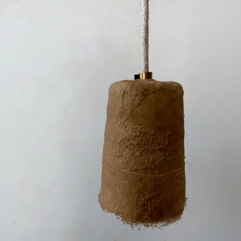 Esta lámpara artesanal está realizada con malla metálica estructural y diferentes tipos de yeso, cordón eléctrico de lino y rosetón en porcelana, portalámparas en latón y cerámica.