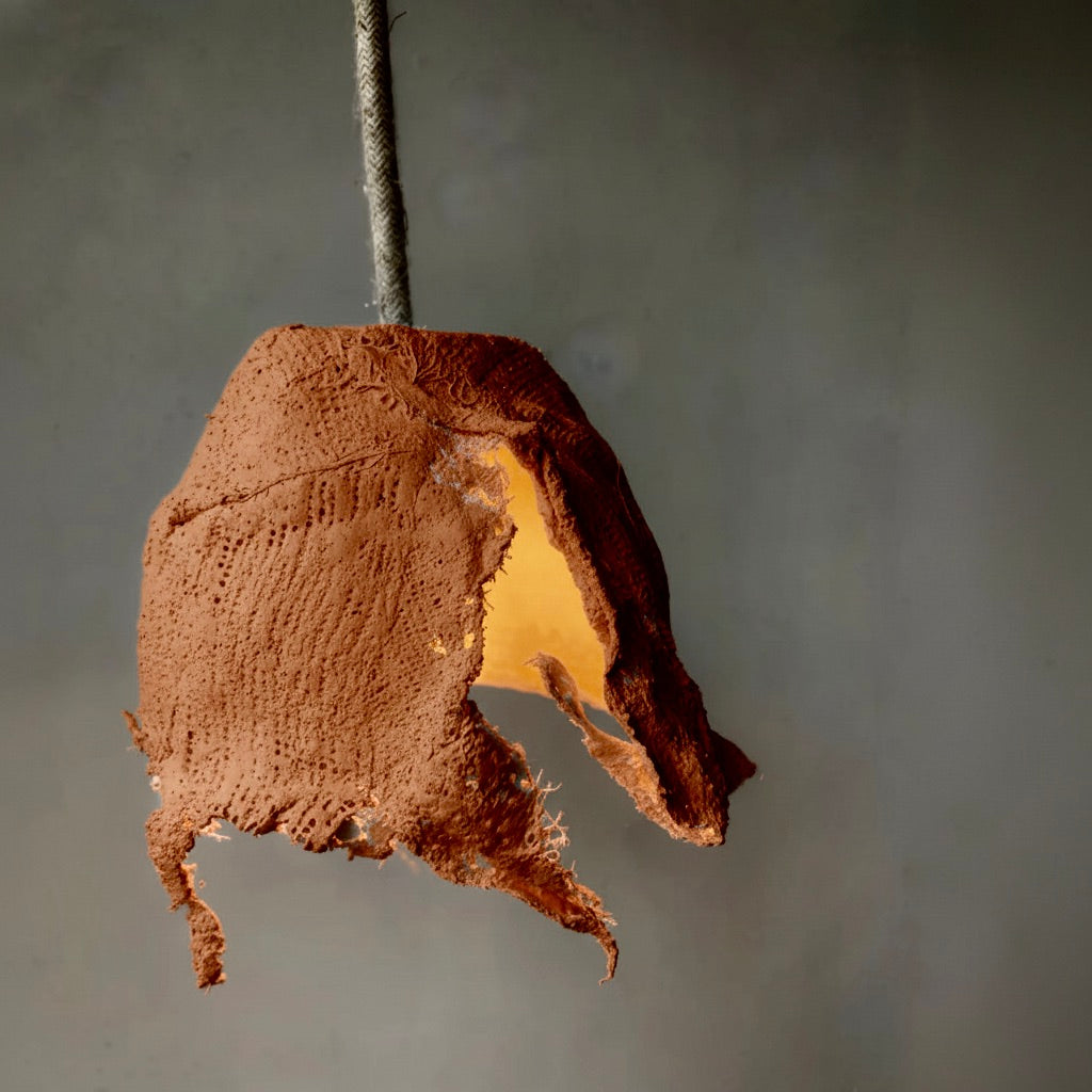 Esta pequeña lámpara está realizada con molde cerámico y vendas de yeso. Su forma única proyecta sombras de una manera única, creando un ambiente muy sugerente.Rematada a mano con cordón textil y rosetón de porcelana. El portalámparas de latón y cerámica le da un aspecto elegante.